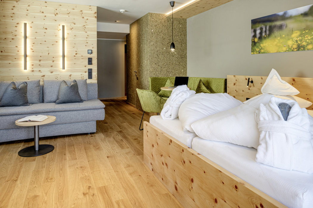 Prilikom planiranja odgovarajućeg poda odmah upada u oči niska ugradbena visina Profi dvoslojne podnice iz Eurowood-a, vlastititog brenda JAF. Zbog toga je idealno prikladan za proširenja i renoviranja. Podnice su dostupne u različitim izborima i veličinama, što ih čini posebno prilagodljivim individualnim potrebama. Mogućnost postavljanja naglasaka u boji različitim premazima naglašava fleksibilne mogućnosti dizajna. Sve to čini dvoslojne podnice iz Eurowooda idealnim podnim proizvodom. U Naturhotelu Tandler ta je raznolikost iskorištena postavljanjem poda ne samo u hotelskim sobama, već i u sauni.